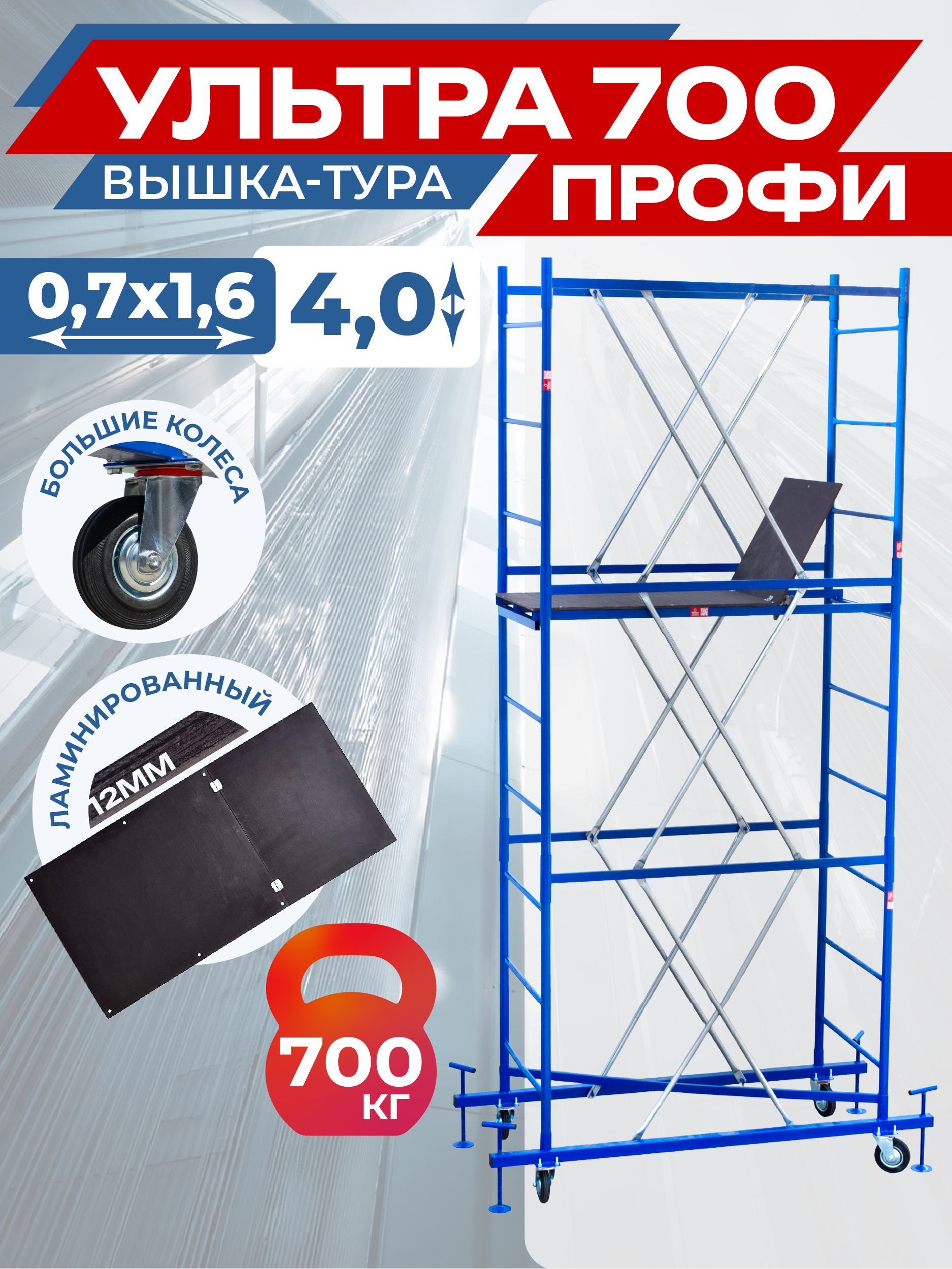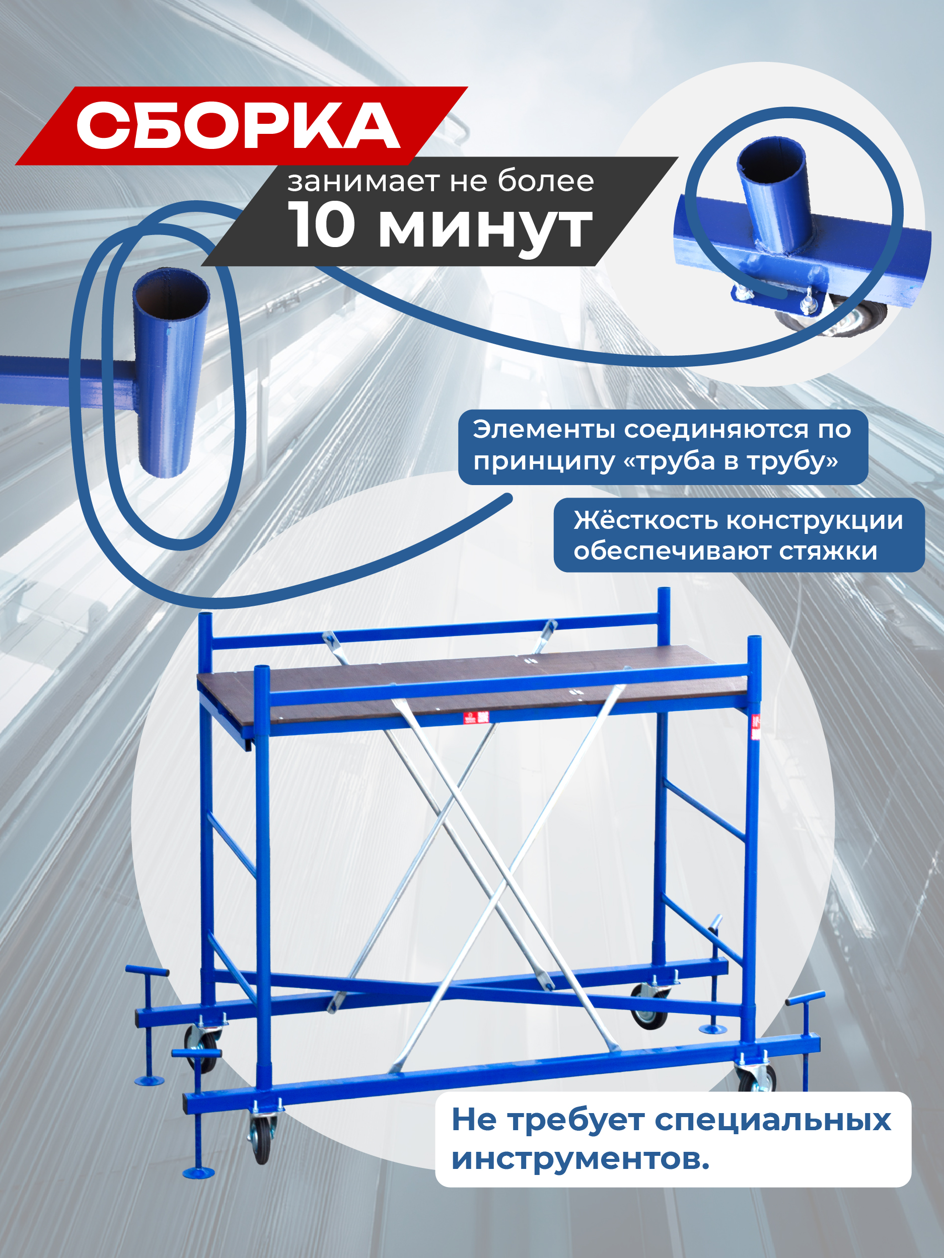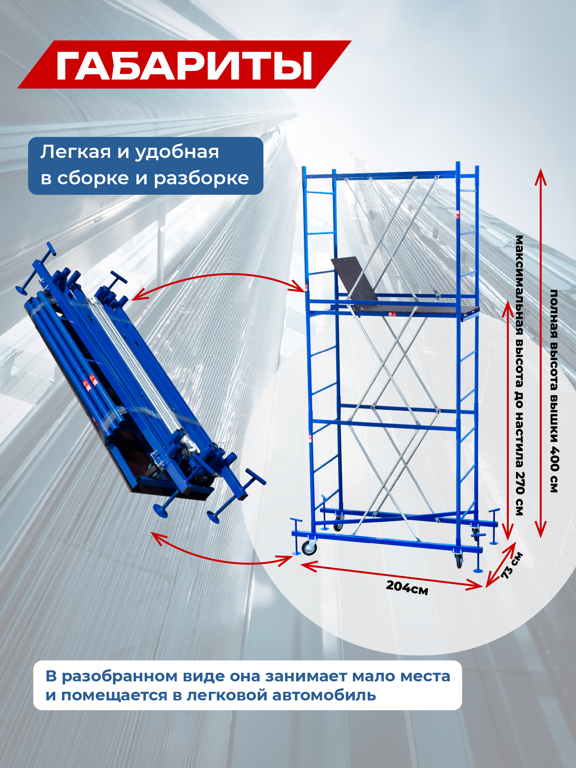 Данную модель вышки можно доращивать по высоте дополнительными секциями (не входят в стоимость) до 7 метров. Секции вышки снабжены диагональными металлическими стяжками. Они обеспечивают дополнительную устойчивость при резких порывах ветра. Настил изготовлен из фанеры толщиной 10 мм и имеет люк для безопасного и удобного перемещения во время работ. Если докупить еще один настил, можно работать вдвоем: вышка выдерживает вес до 700 кг.