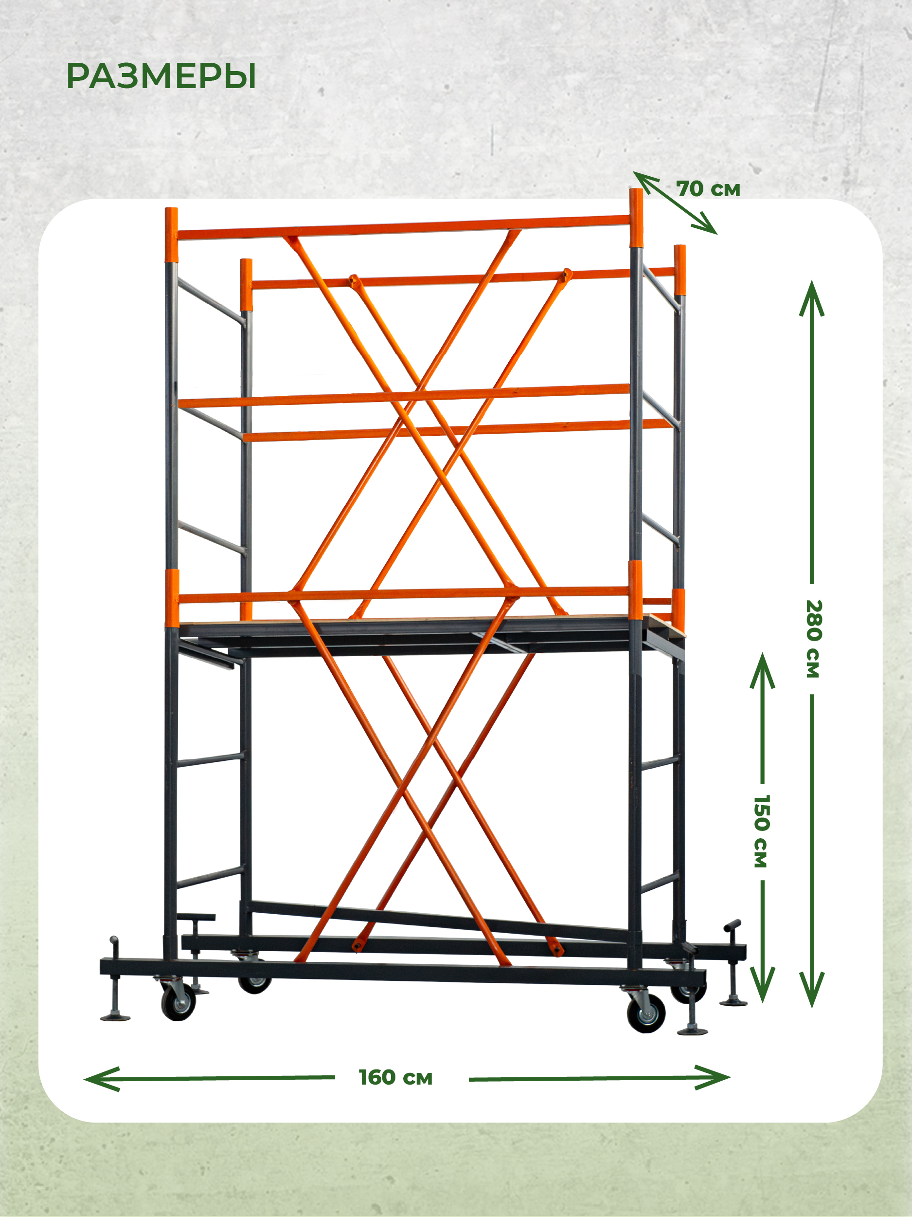 Модель компактна, ширина ее базового блока всего 0,7х1,6 метра. Это дает возможность работать на вышке в узких проемах, на тротуарах, не мешая пешеходам. Высота вышки — 2,8 метра с максимальной высотой настила 1,5 метра. Рабочая площадка состоит из одного настила с люком, изготавливаемого из стальных труб по периметру, покрытых сверху прочным фанерным листом.