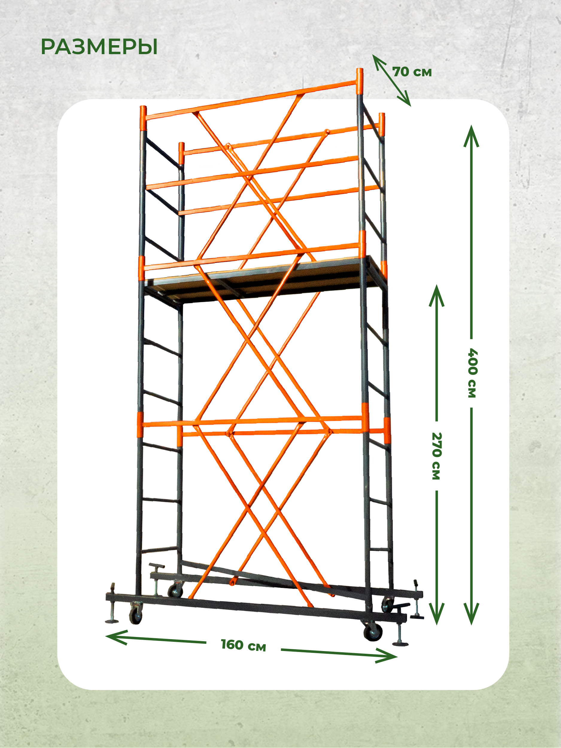 Модель компактна, ширина ее базового блока всего 0,7х1,6 метра. Это дает возможность работать на вышке в узких проемах, на тротуарах, не мешая пешеходам. Высота вышки — 4 метра с шагом секции 1,2 метра. Рабочая площадка состоит из одного настила с люком, изготавливаемого из стальных труб по периметру, покрытых сверху прочным фанерным листом.