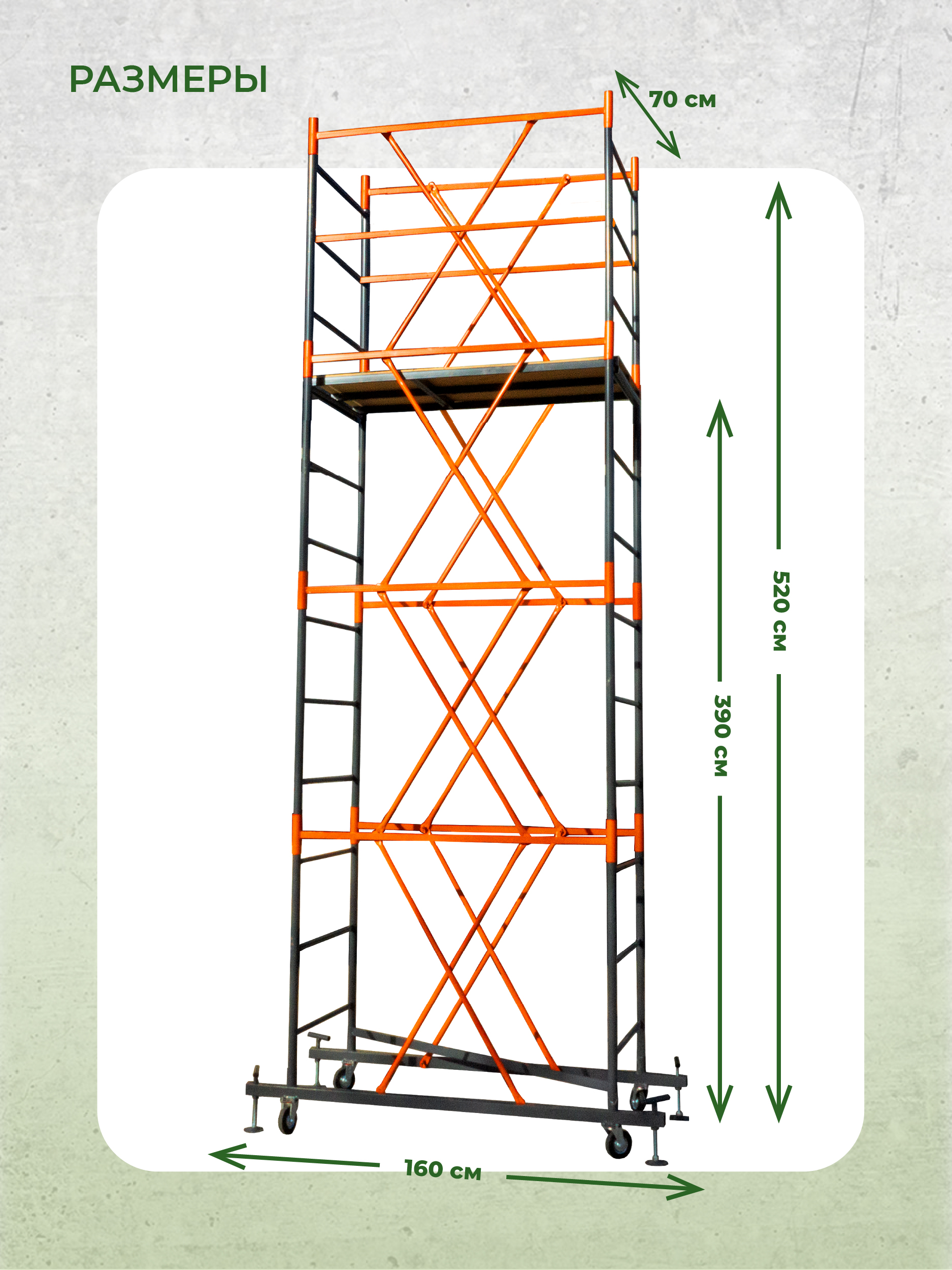 Модель компактна, ширина ее базового блока всего 0,7х1,6 метра. Это дает возможность работать на вышке в узких проемах, на тротуарах, не мешая пешеходам. Высота вышки — 5,2 метра с шагом секции 1,2 метра. Рабочая площадка состоит из одного настила с люком, изготавливаемого из стальных труб по периметру, покрытых сверху прочным фанерным листом.