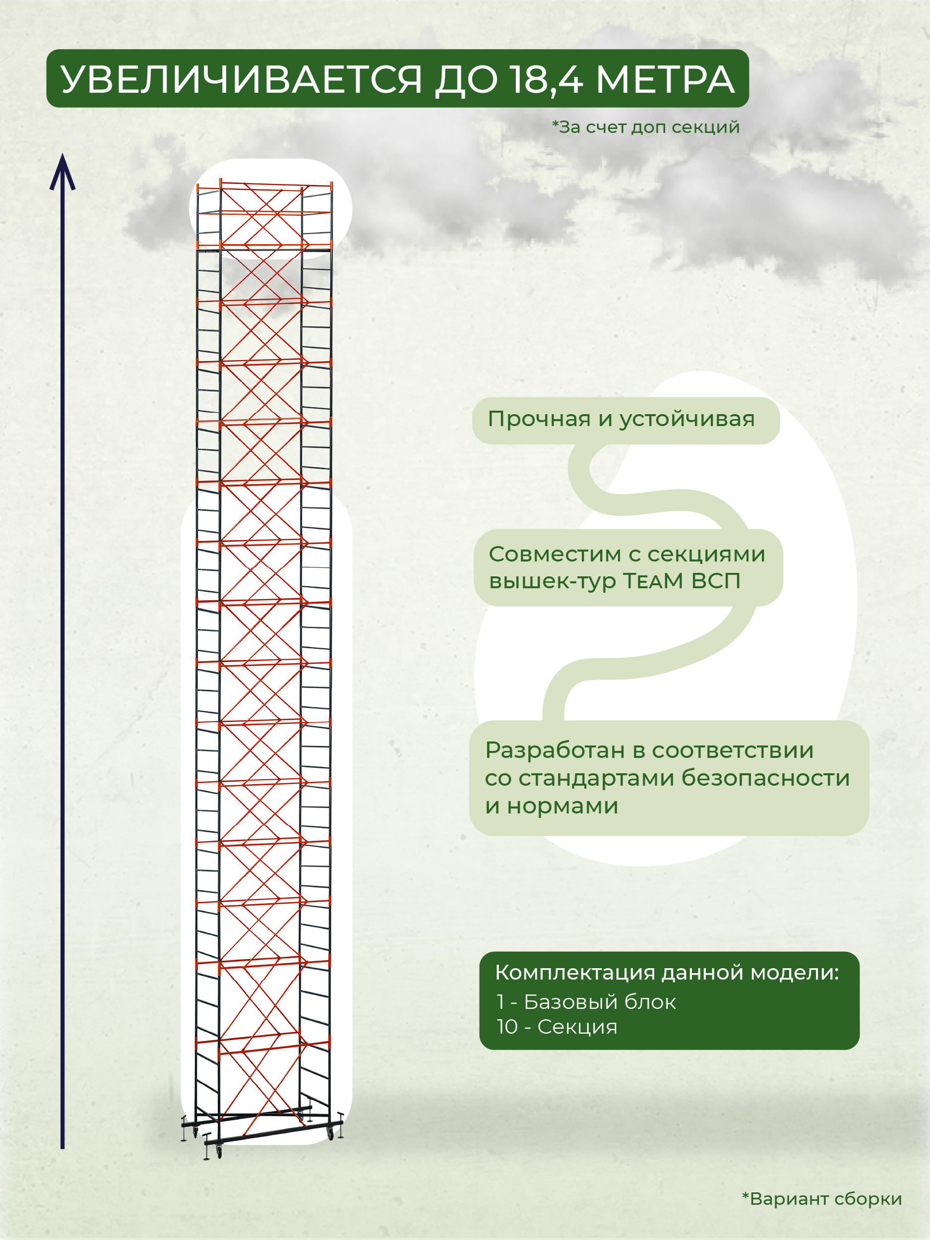 Сборно-разборная передвижная стальная вышка-тура TeaM высотой 13,56 метра* используется для различных строительных, монтажных, отделочных работ, а также ремонта внутри и снаружи помещений.