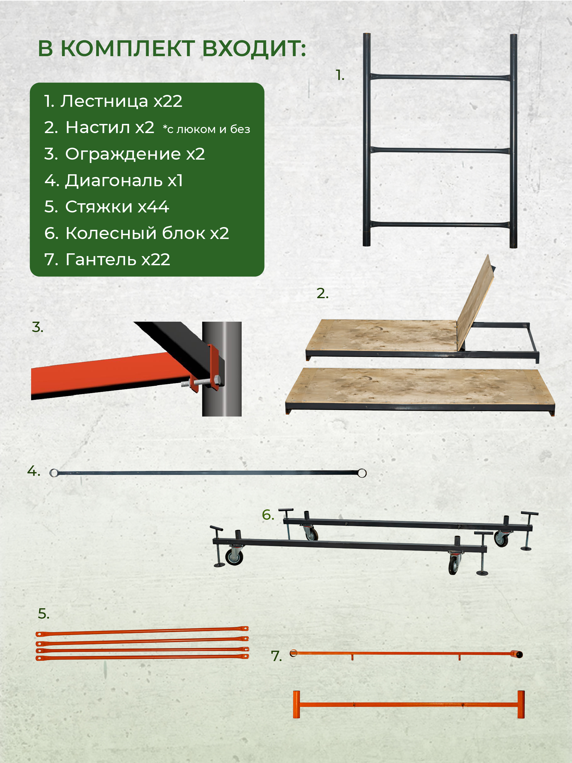 Вышка состоит из колесного основания, лестничных стальных рам секций и секции ограждения, которые соединяются между собой металлическими диагональными связями и гантелями, придающих ей устойчивость и обеспечивающих безопасность работ на высоте. Простая конструкция — сборка не требует профессиональных навыков и дополнительного инструмента. Все элементы вышки стыкуются между собой по принципу «труба в трубу» и фиксируются флажковым механизмом.