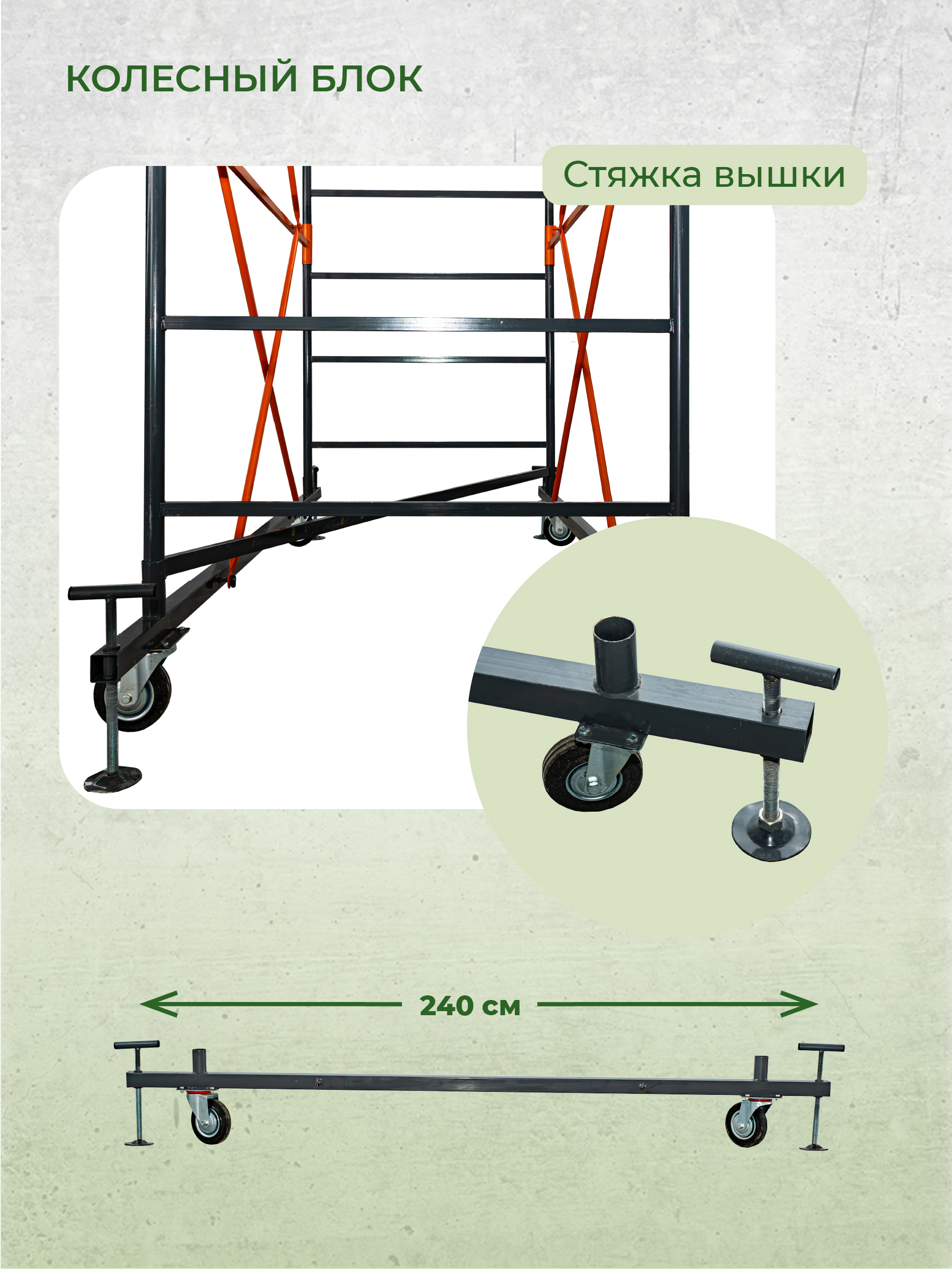 Отличает вышку строительную ВСП TeaM 250/1.2 изготовление из стальных труб, которые для большей долговечности и устойчивости к химическим веществам покрыты защитной полимерной краской. С помощью обрезиненных колес данную вышку-туру можно быстро и без больших физических усилий переместить с одного места на другое. В момент проведения работ вышку необходимо зафиксировать тормозными винтовыми опорами, находящихся рядом с каждым колесом. Также ими можно тонко отрегулировать высоту вышки. Это необходимо, если вы работаете на неровной площадке.