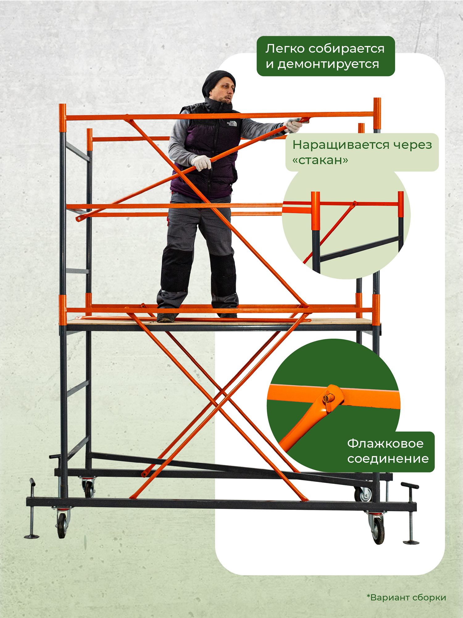 Вышка состоит из колесного основания, лестничных стальных рам секций и секции ограждения, которые соединяются между собой металлическими диагональными связями и гантелями, придающих ей устойчивость и обеспечивающих безопасность работ на высоте. Простая конструкция — сборка не требует профессиональных навыков и дополнительного инструмента. Все элементы вышки стыкуются между собой по принципу «труба в трубу» и фиксируются флажковым механизмом.