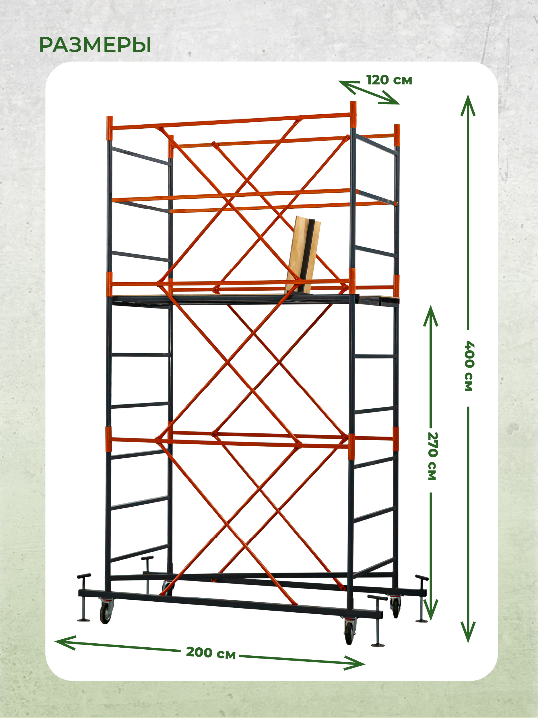 Вышка рассчитана на вес до 250 кг. На ней комфортно может разместиться рабочий с необходимым оборудованием.