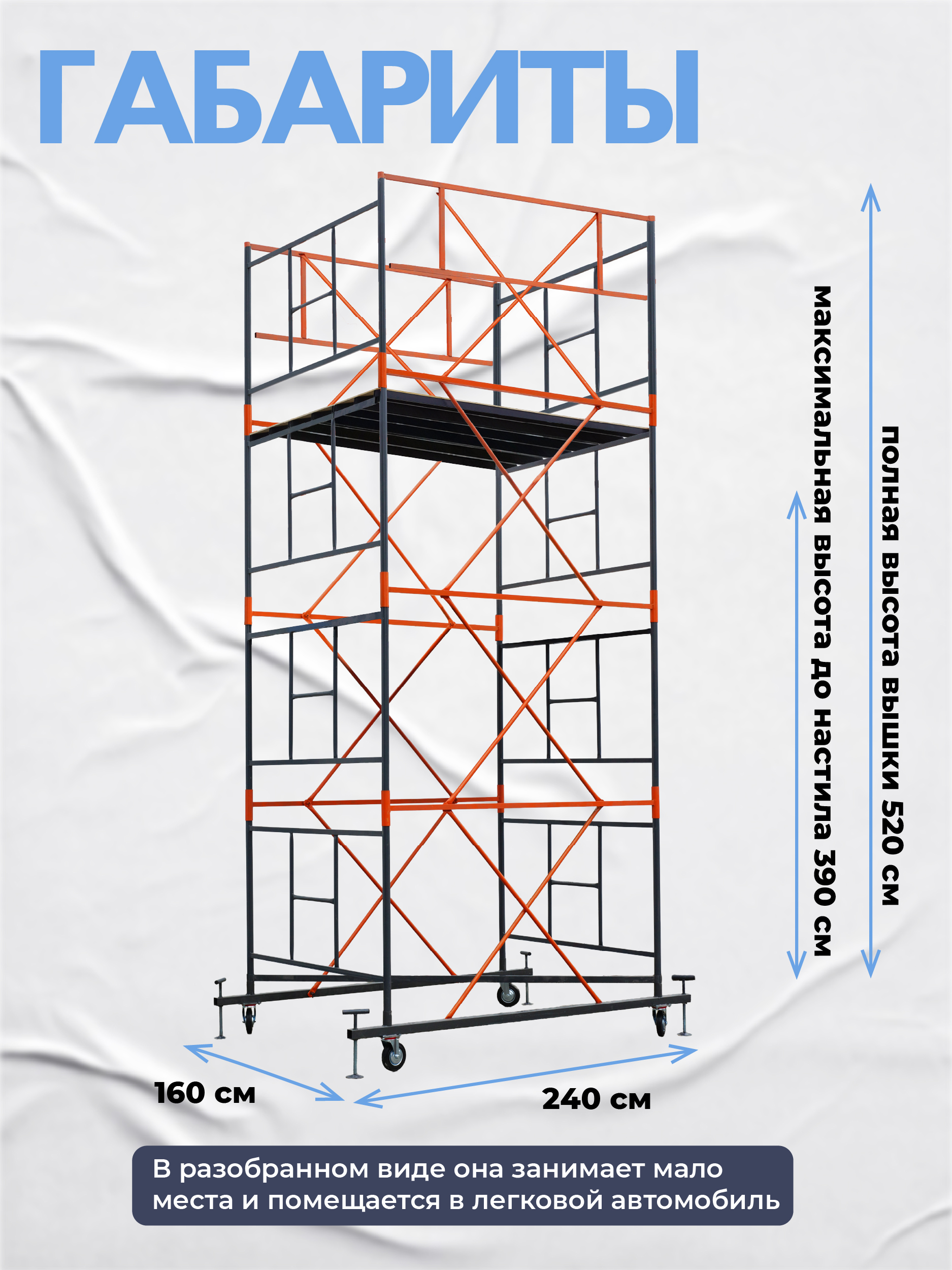 Вышка рассчитана на вес до 250 кг. На ней комфортно может разместиться рабочий с необходимым оборудованием.