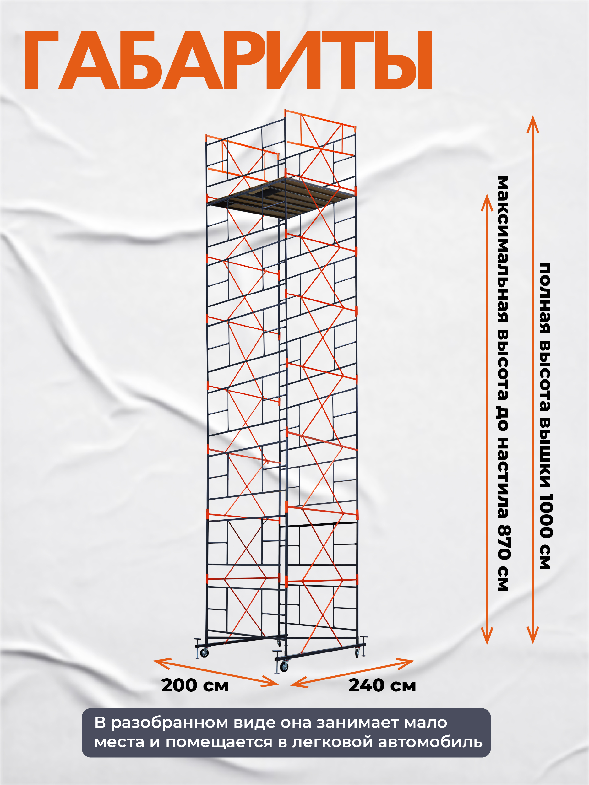 Сборно-разборная передвижная стальная вышка-тура TeaM высотой 10,0 метра используется для различных строительных, монтажных, отделочных работ, а также ремонта внутри и снаружи помещений.