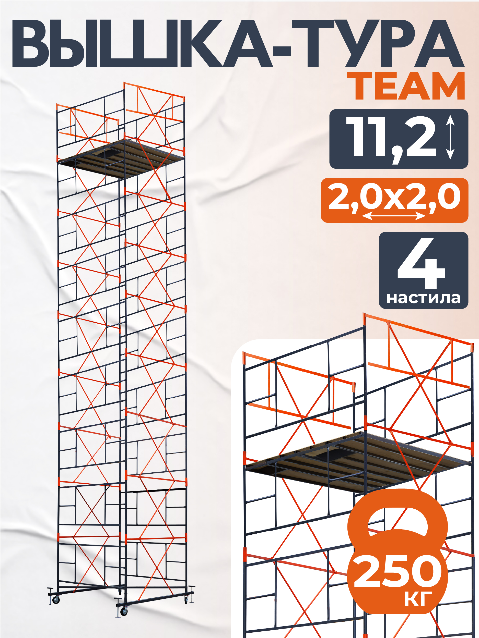 Сборно-разборная передвижная стальная вышка-тура TeaM высотой 11,2 метра используется для различных строительных, монтажных, отделочных работ, а также ремонта внутри и снаружи помещений.