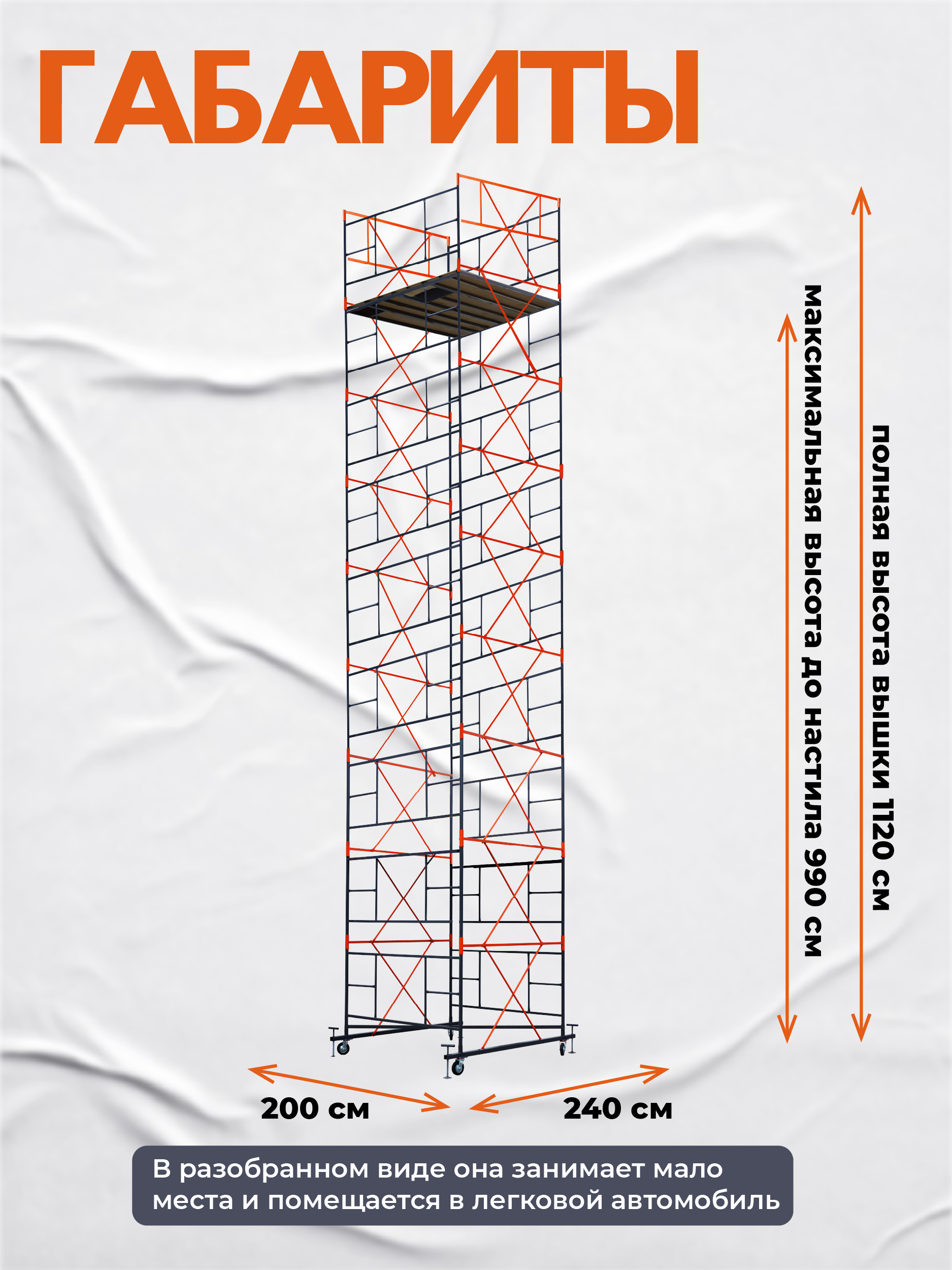 Модель имеет ширину базового блока 2,0х2,0 метра. Высота вышки — 11,2 метра. Ее можно дорастить дополнительными секциями до 20,8 метров с шагом секции 1,2 метра. Рабочая площадка состоит из одного настила с люком, изготавливаемого из стальных труб по периметру, покрытых сверху прочным фанерным листом.