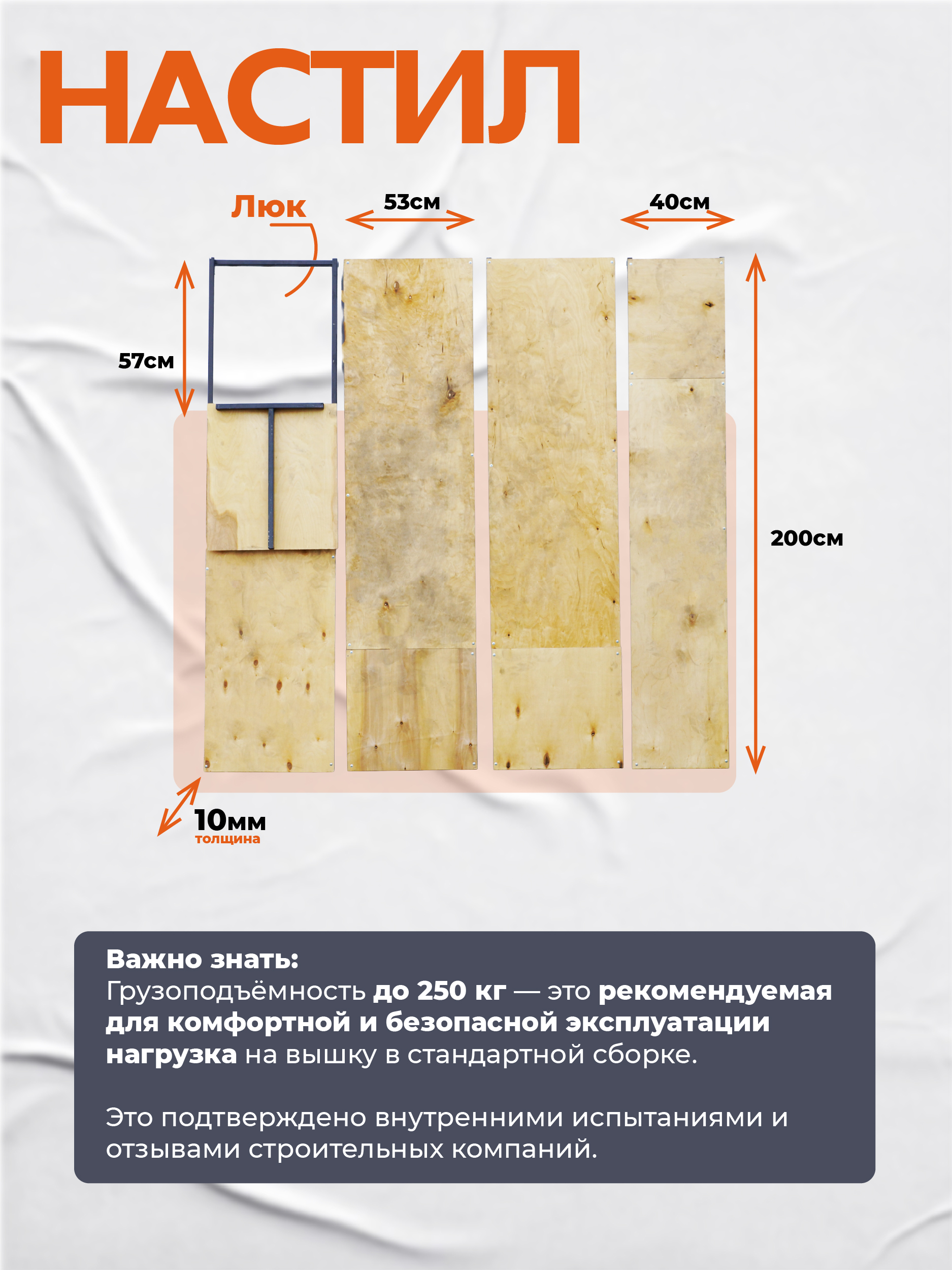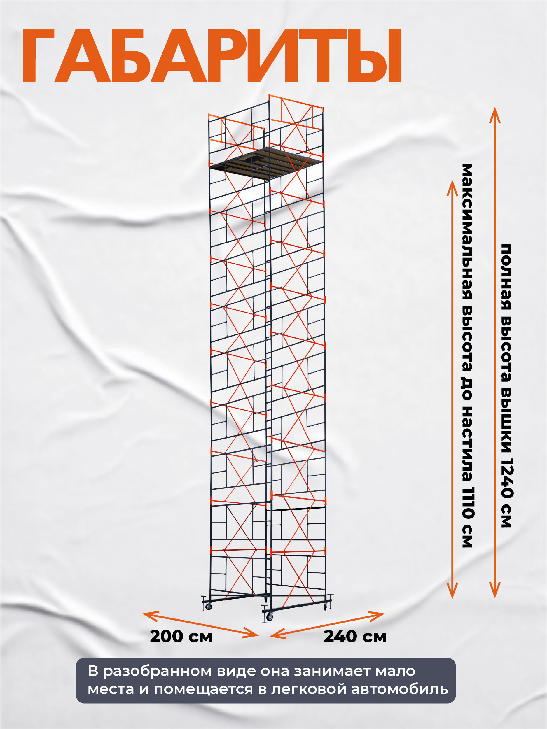 Вышка рассчитана на вес до 250 кг. На ней комфортно может разместиться рабочий с необходимым оборудованием.