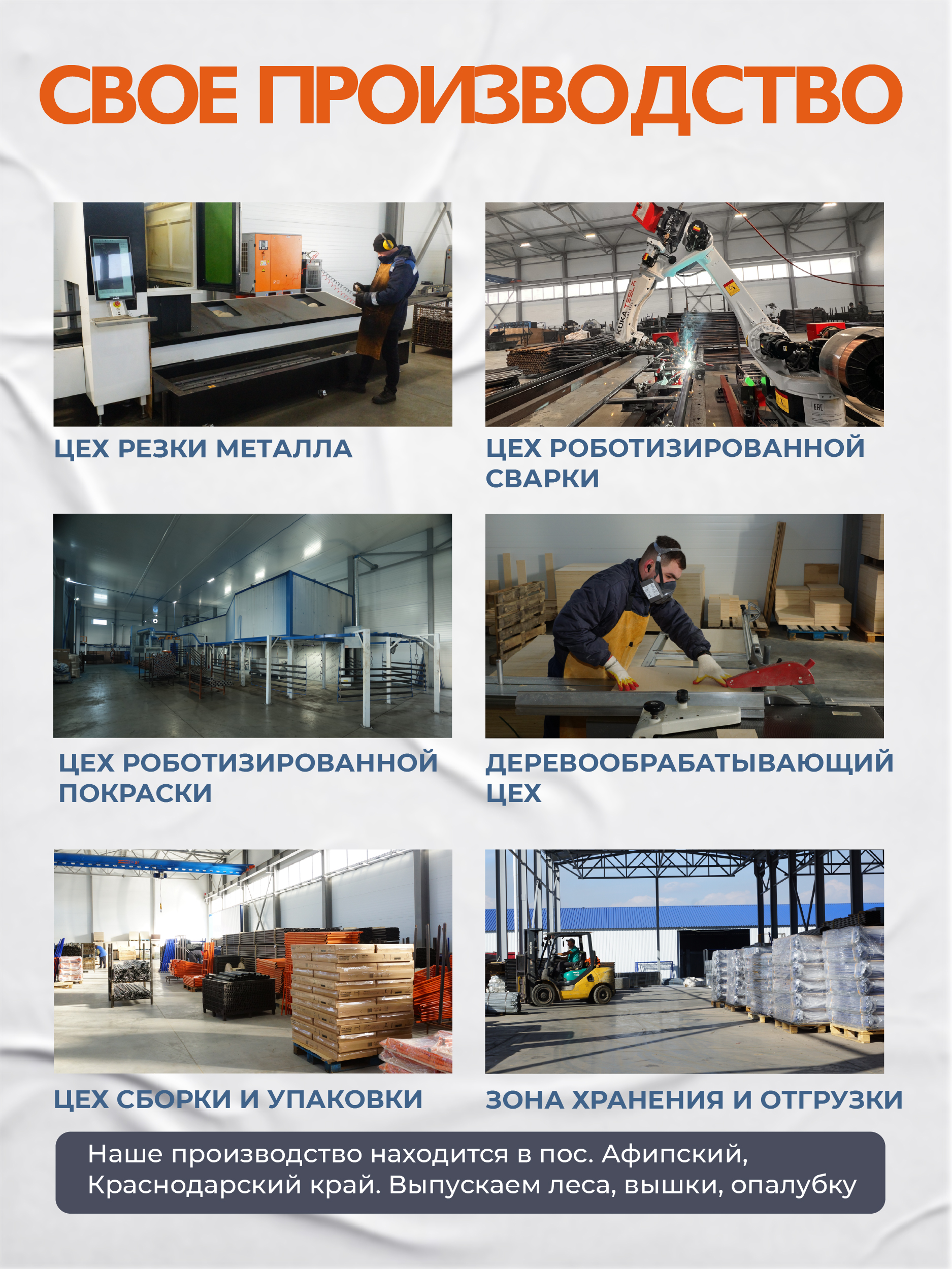 Вышка рассчитана на вес до 250 кг. На ней комфортно может разместиться рабочий с необходимым оборудованием.