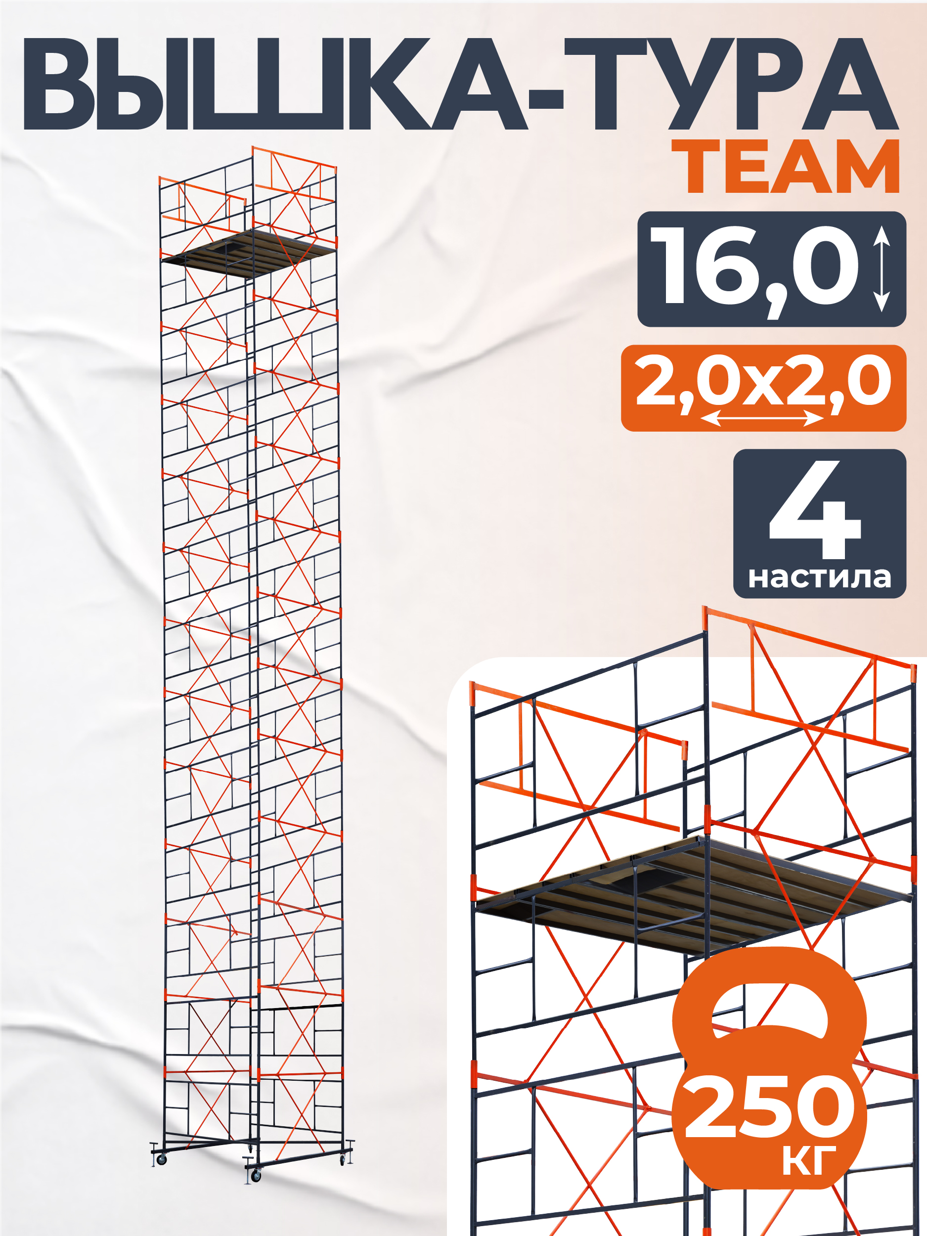 Сборно-разборная передвижная стальная вышка-тура TeaM высотой 16,0 метра используется для различных строительных, монтажных, отделочных работ, а также ремонта внутри и снаружи помещений.