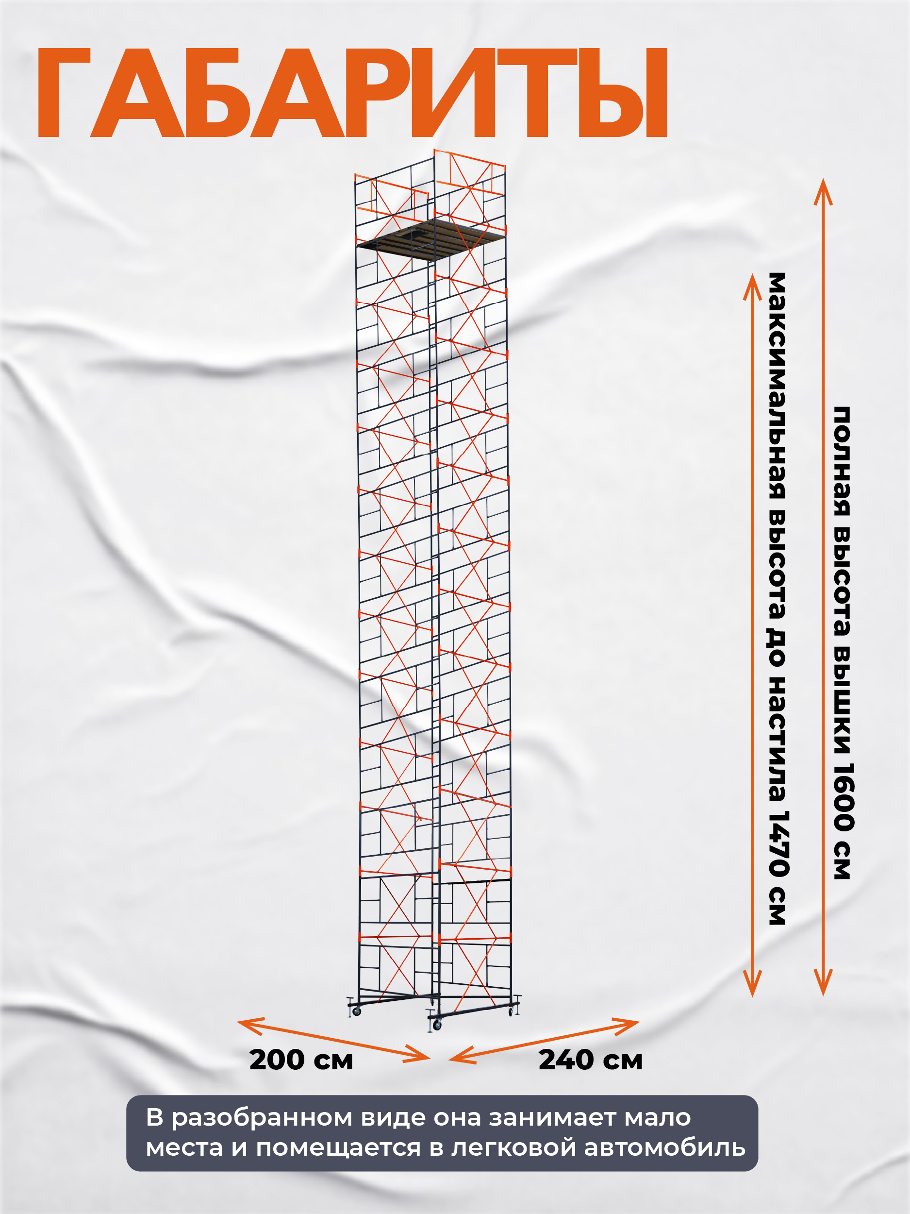 Модель имеет ширину базового блока 2,0х2,0 метра. Высота вышки — 16,0 метра. Ее можно дорастить дополнительными секциями до 20,8 метров с шагом секции 1,2 метра. Рабочая площадка состоит из одного настила с люком, изготавливаемого из стальных труб по периметру, покрытых сверху прочным фанерным листом.