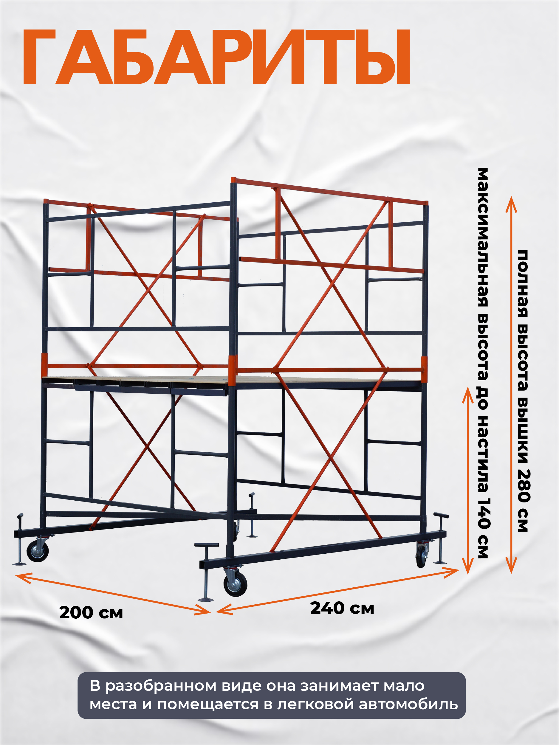 Вышка рассчитана на вес до 250 кг. На ней комфортно может разместиться рабочий с необходимым оборудованием.
