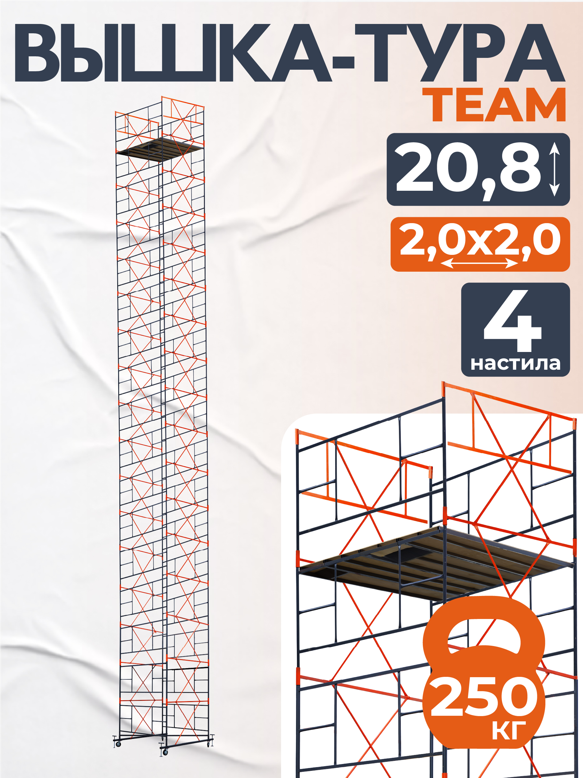 Сборно-разборная передвижная стальная вышка-тура TeaM высотой 20,8 метра используется для различных строительных, монтажных, отделочных работ, а также ремонта внутри и снаружи помещений.