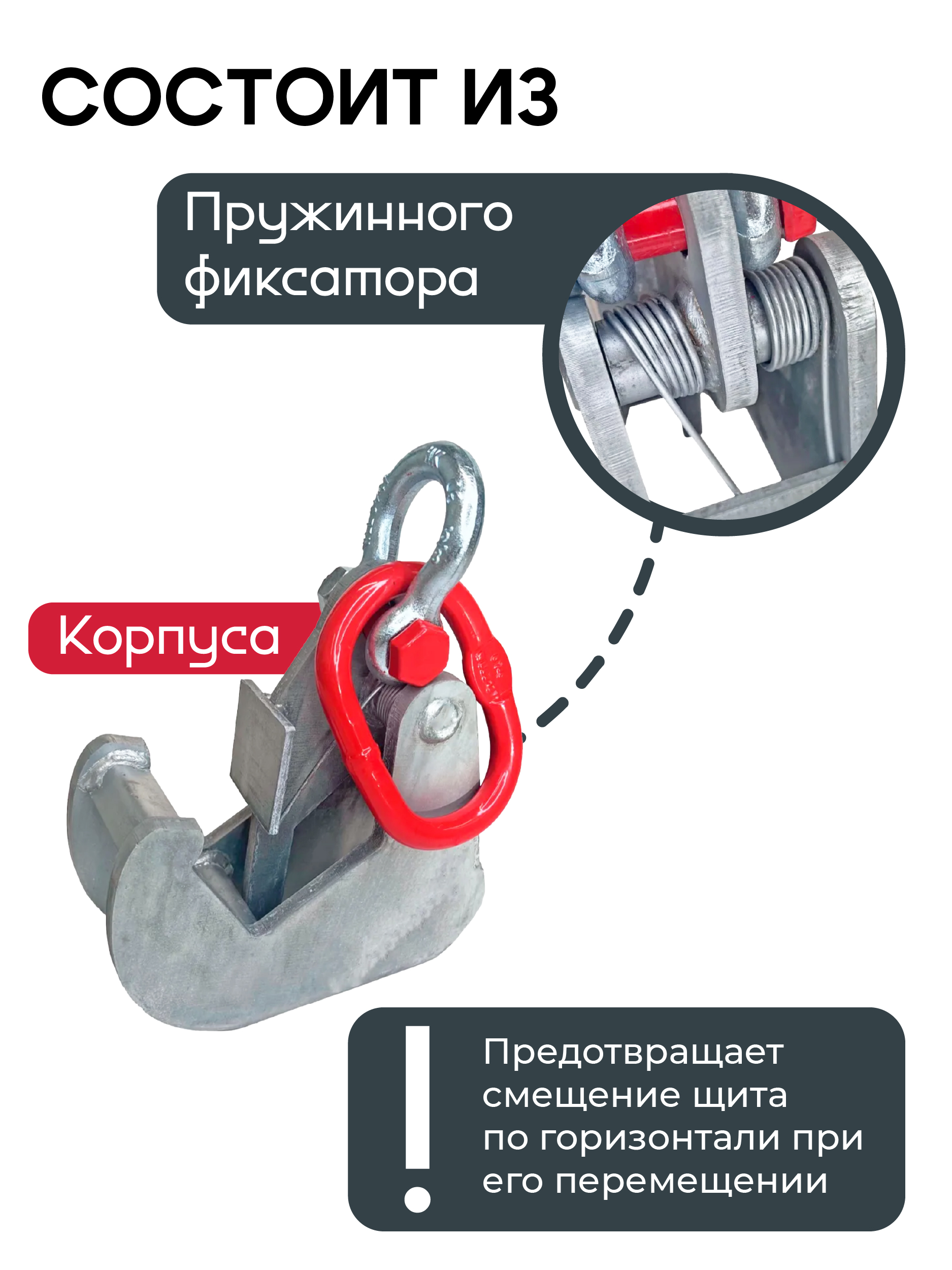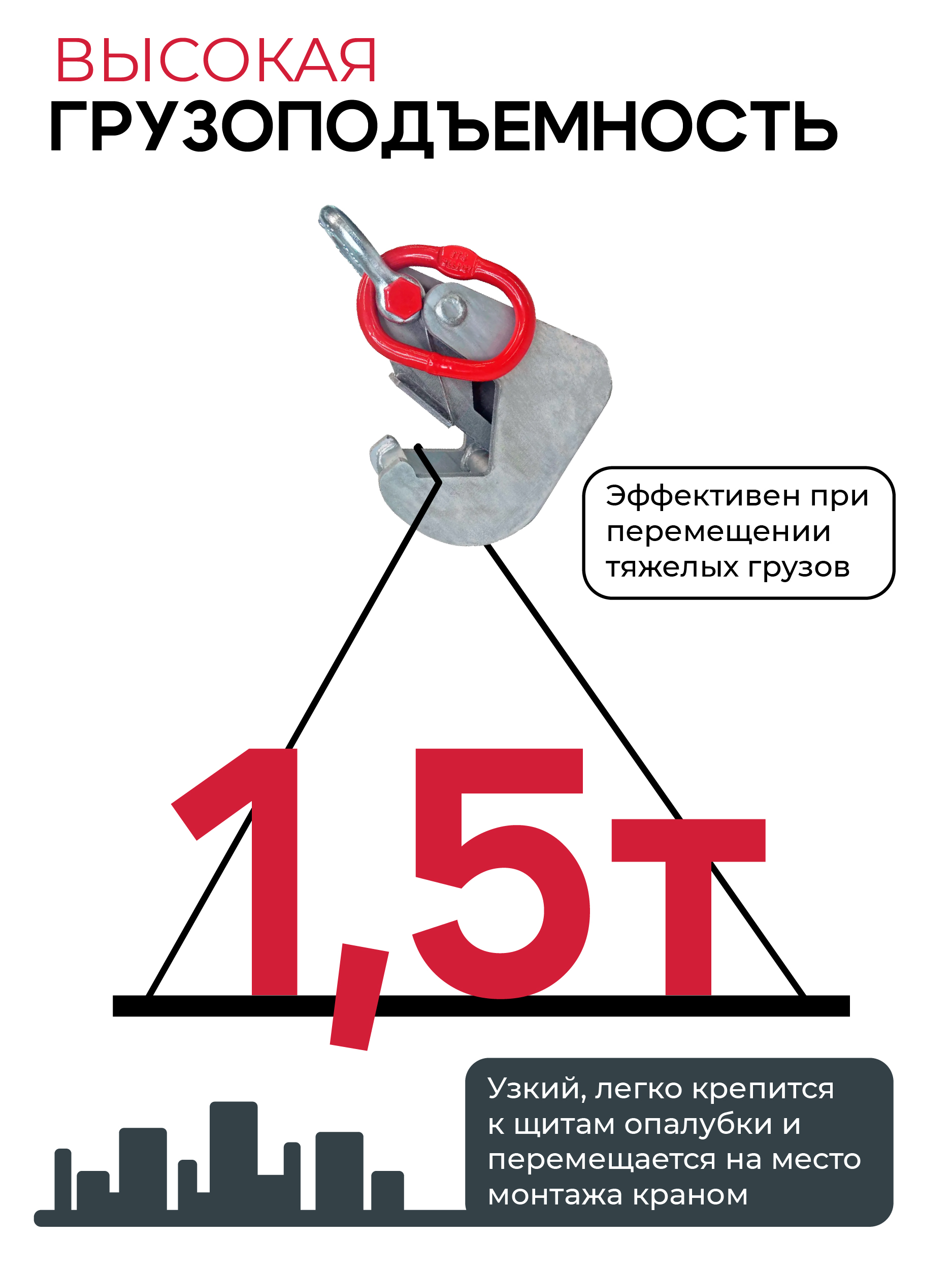 Монтажный захват с узким захватом предназначен для крепления опалубки и собранных панелей опалубки с помощью грузоподъемной техники. Он состоит из корпуса и пружинного фиксатора, который предотвращает смещение щита по горизонтали при его перемещении. Парное применение монтажных захватов обеспечивает надежную фиксацию поднимаемого груза с необходимым запасом прочности. Захват оцинкован, что обеспечивает его долговечность и защиту от коррозии. Активно используется в монолитном строительстве и обладает грузоподъемностью 1500 кг. Каждое изделие имеет технический паспорт, в соответствии с которым должен проводиться процесс эксплуатации.