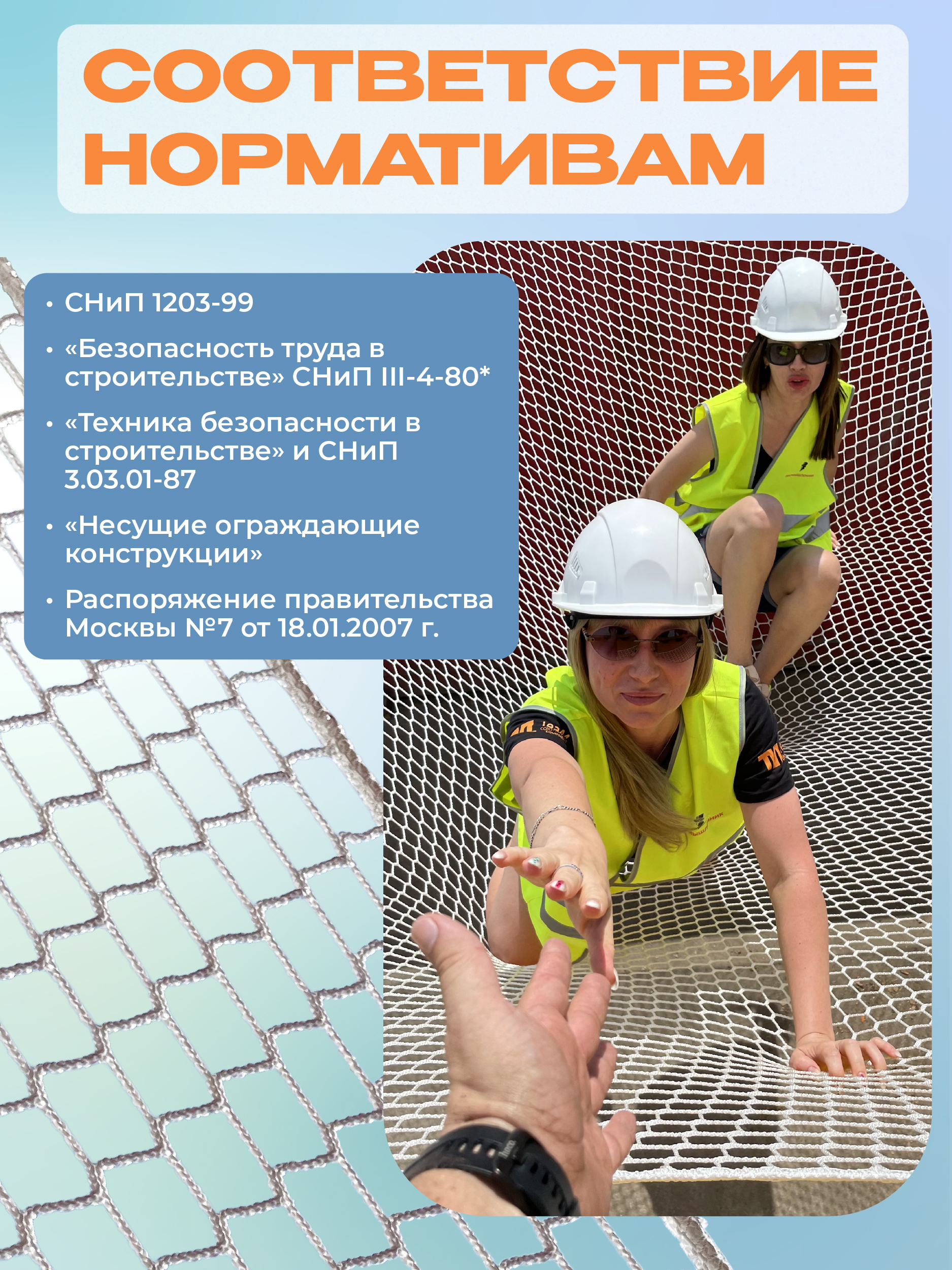 Применение защитно-улавливающих сеток в качестве дополнительного средства защиты при строительстве монолитных и монолитно-кирпичных зданий различного назначения, начиная с третьего этажа и выше, рекомендовано строительным организациям в соответствии со СНиП 1203-99 «Безопасность труда в строительстве» СНиП III-4-80* «Техника безопасности в строительстве» и СНиП 3.03.01-87 «Несущие ограждающие конструкции», а также распоряжением московского правительства №7 от 18.01.2007 г: «О применении защитно-улавливающих сеток на строительных объектах города Москвы»